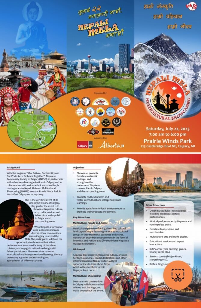 With a slogan of “Our Culture, Our Identity and Our Pride: Let’s Embrace together”, NCSC, in partnership with Nepalese organizations in Calgary and in collaboration with other ethnic communities, is hosting one day Nepali Mela and Cultural Showcasing (NMCS) event at Prairie Wind Parks in West Winds Drive on 22 July 2023 from 9 AM to 6 PM. First in its kind in the history of Calgary, the key goal of the event is to showcase Nepali culture, arts and crafts, cuisine, and talents to a wider public in Calgary and the area. The event helps increase visibility of Nepalese in Calgary and demonstrates their caliber and volunteerism whenever required. On the top of this, the event provides an opportunity for local entrepreneurs to promote their products, offer their services and advertise their businesses to wider audience outside of Nepali diaspora. We are also taking a lead to foster multiculturalism by inviting other ethnic communities in Calgary to showcase their culture and heritage and help foster intergenerational and intercultural learning. We have a hope that there will be at least 5,000 people attending the Mela. We are also hoping to get Nepalese audience and performers from outside of Calgary to observe and enjoy our event.